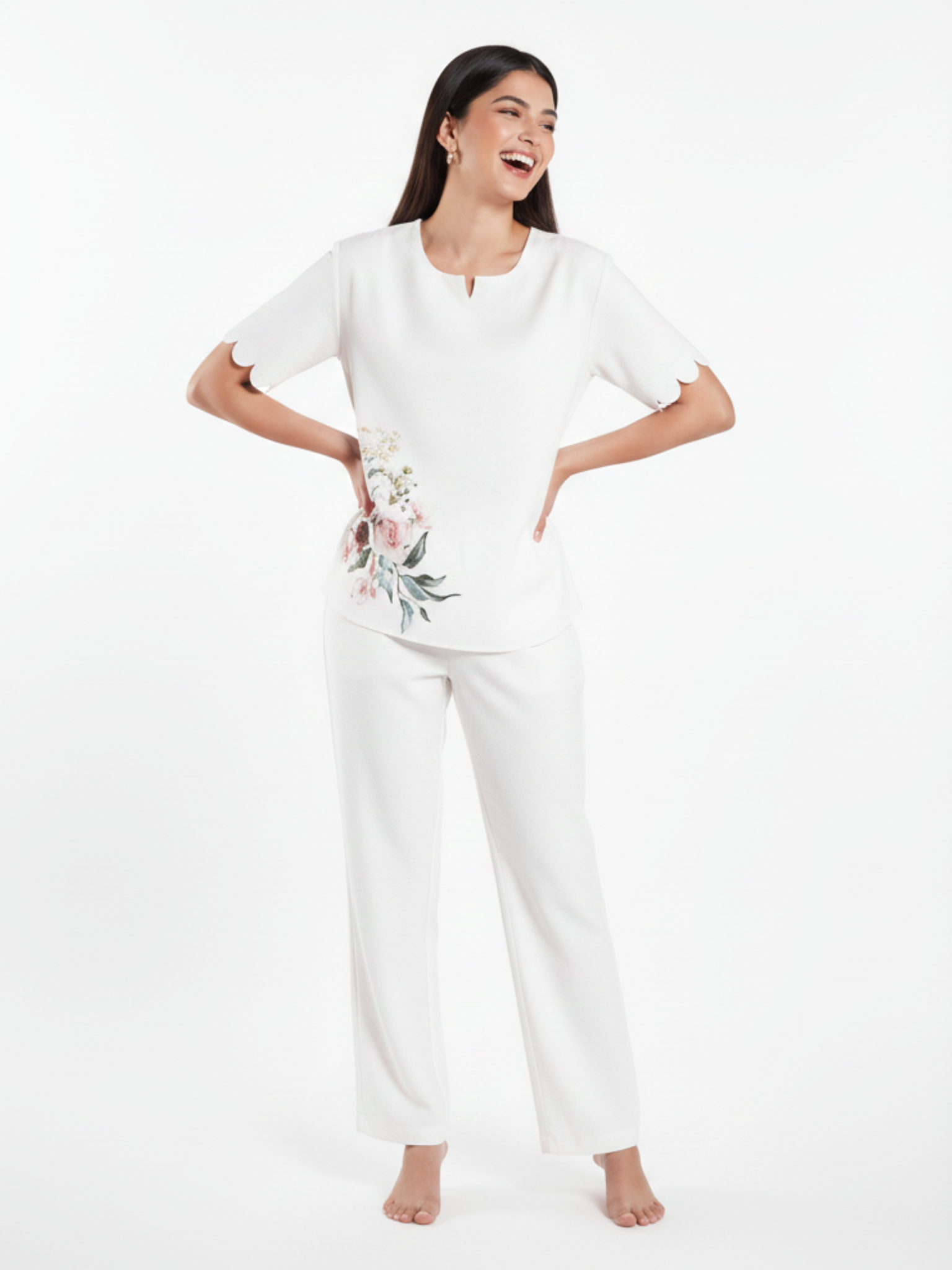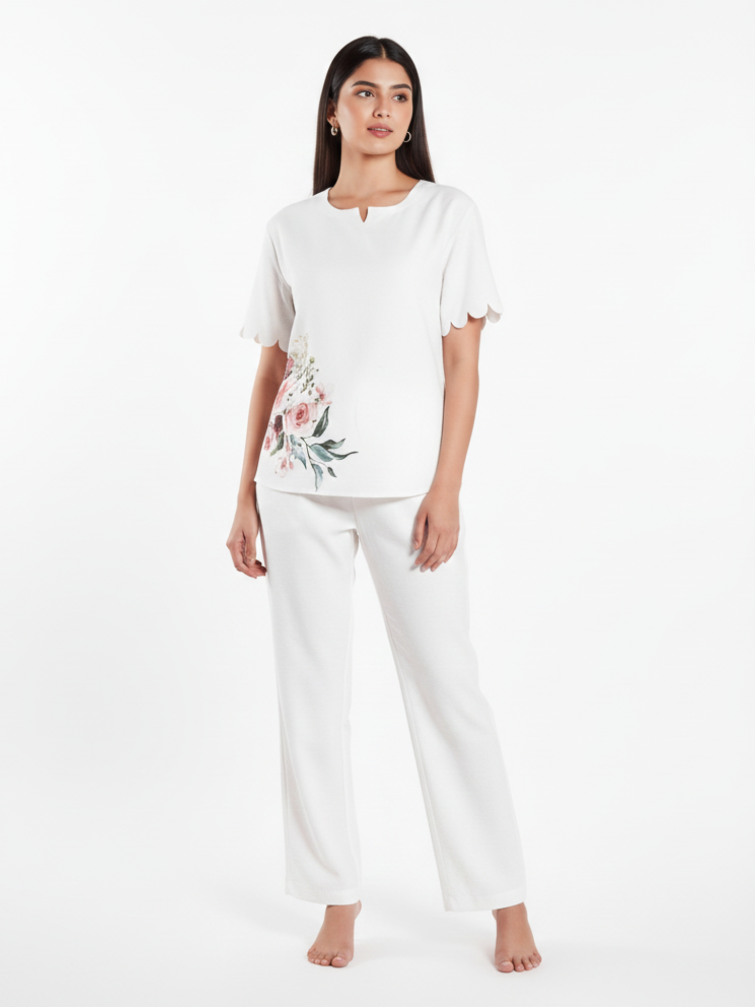 From the Brand Melodie, Curated by Covera. This white cotton co-ord set features delicate watercolor floral artwork and relaxed tailoring, offering a serene and sophisticated option for those who appreciate minimalist elegance in their loungewear.