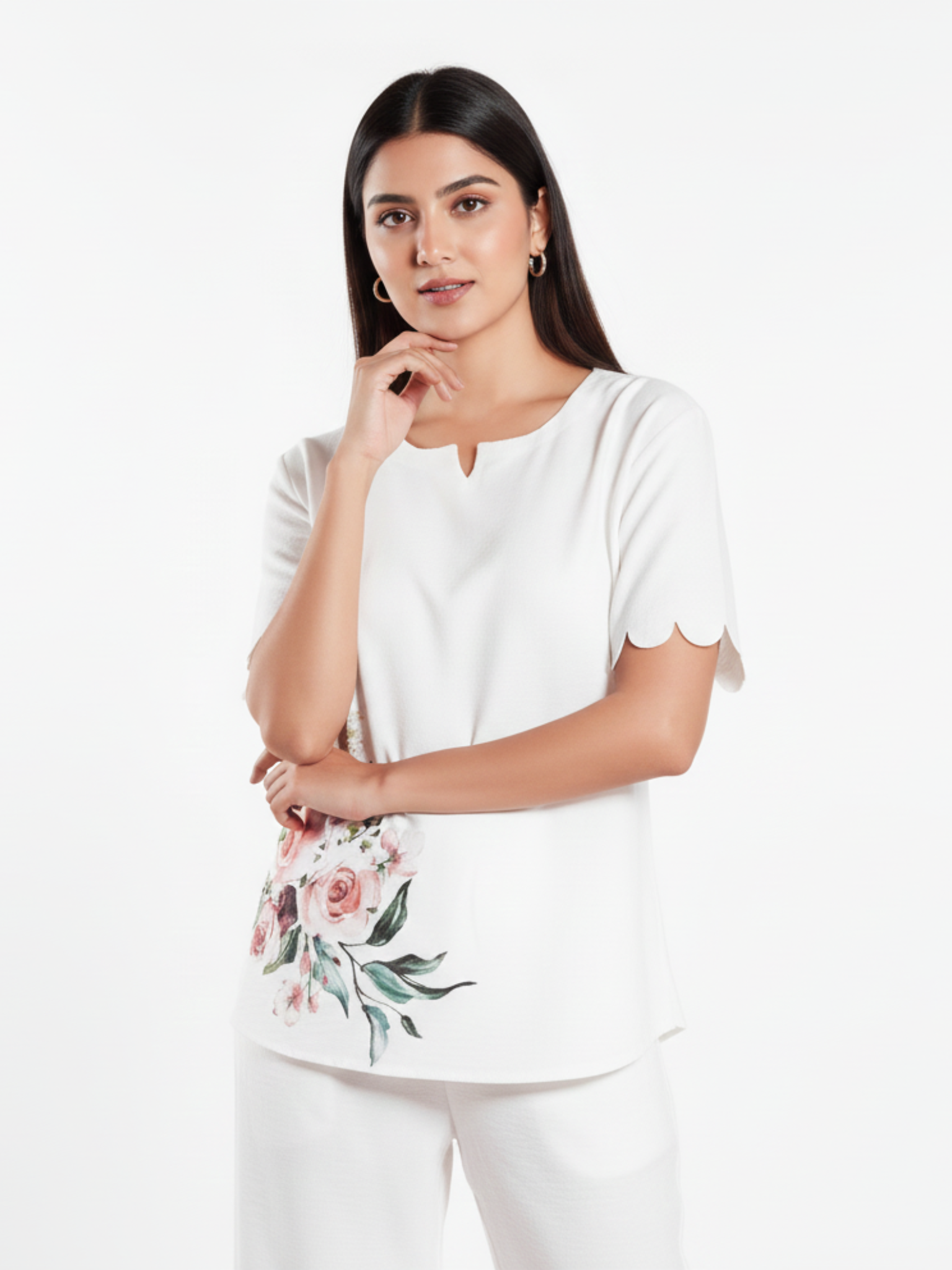 - Graceful watercolor floral print in soft pink, white, and sage green adorns the lower right side of the top