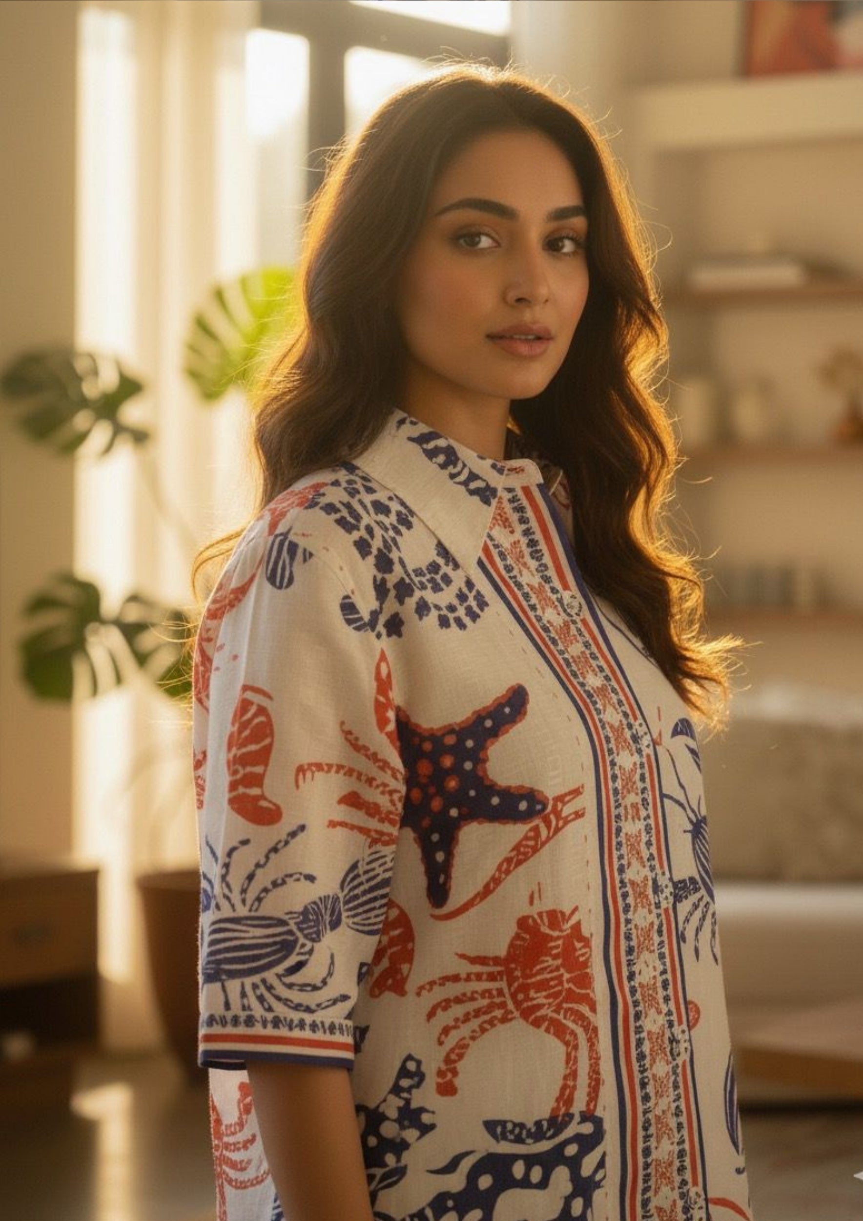 • Tropical-Inspired Print – Features vibrant sea motifs of shells, crabs, and starfish in coral and indigo hues.