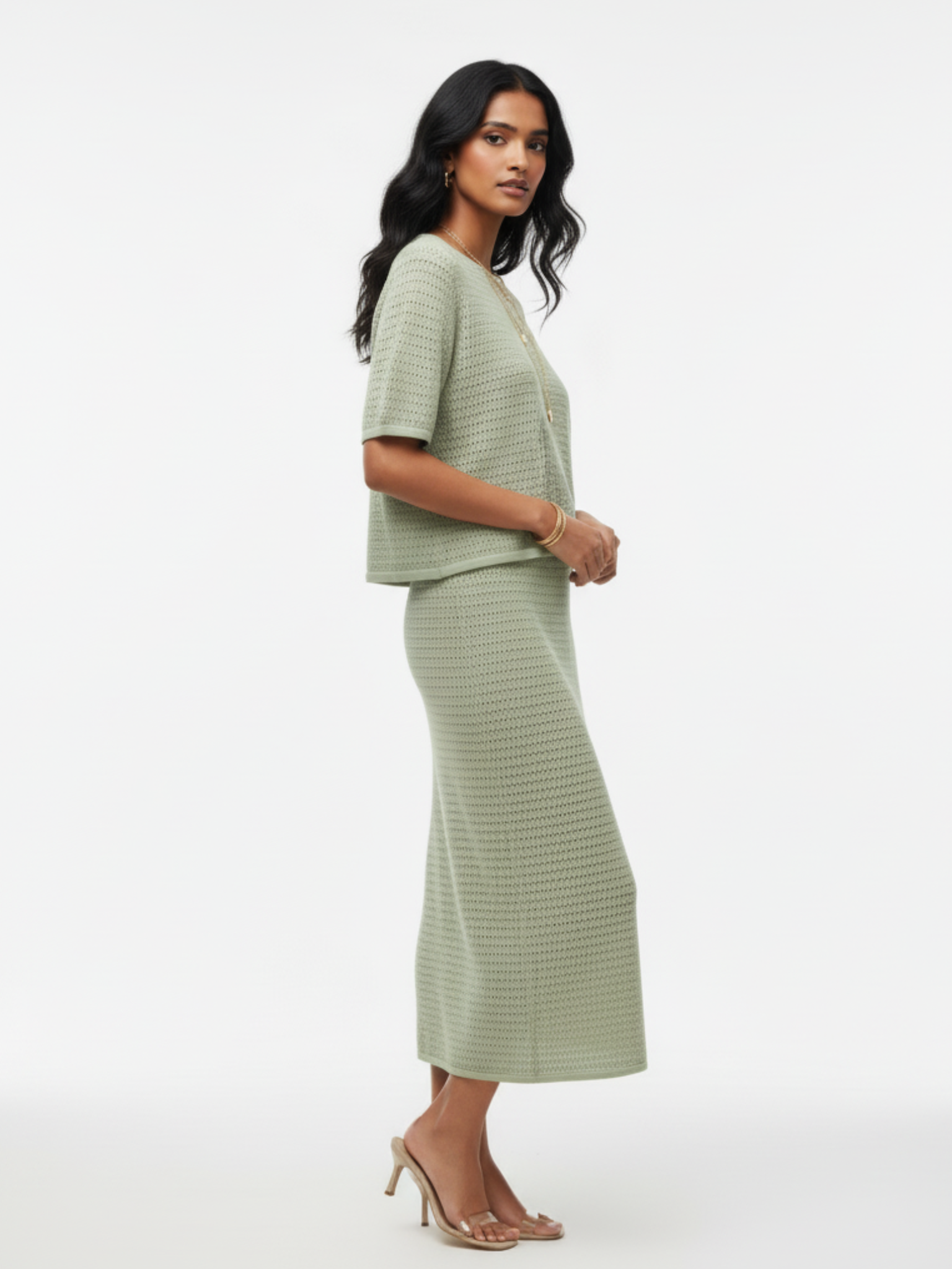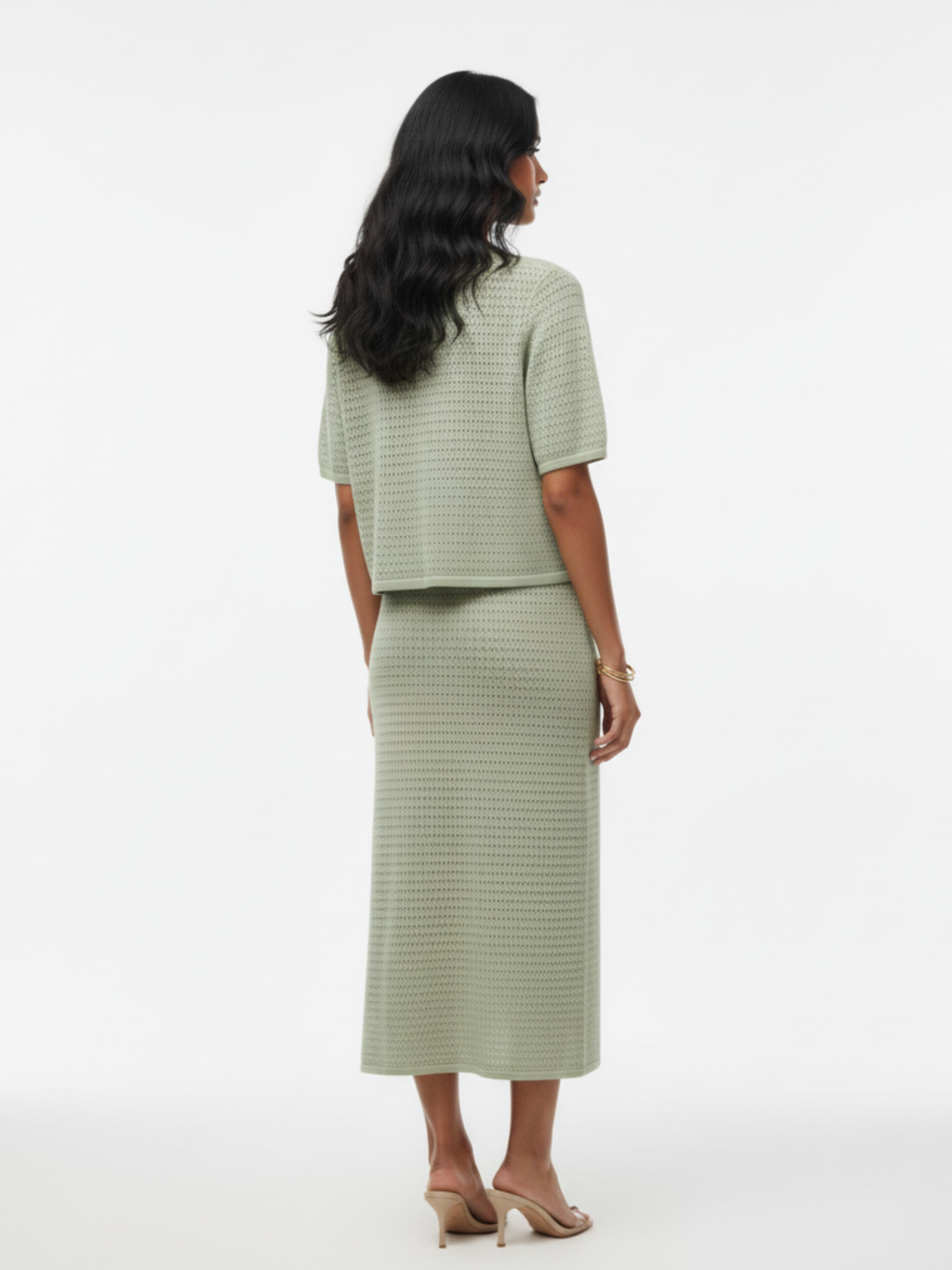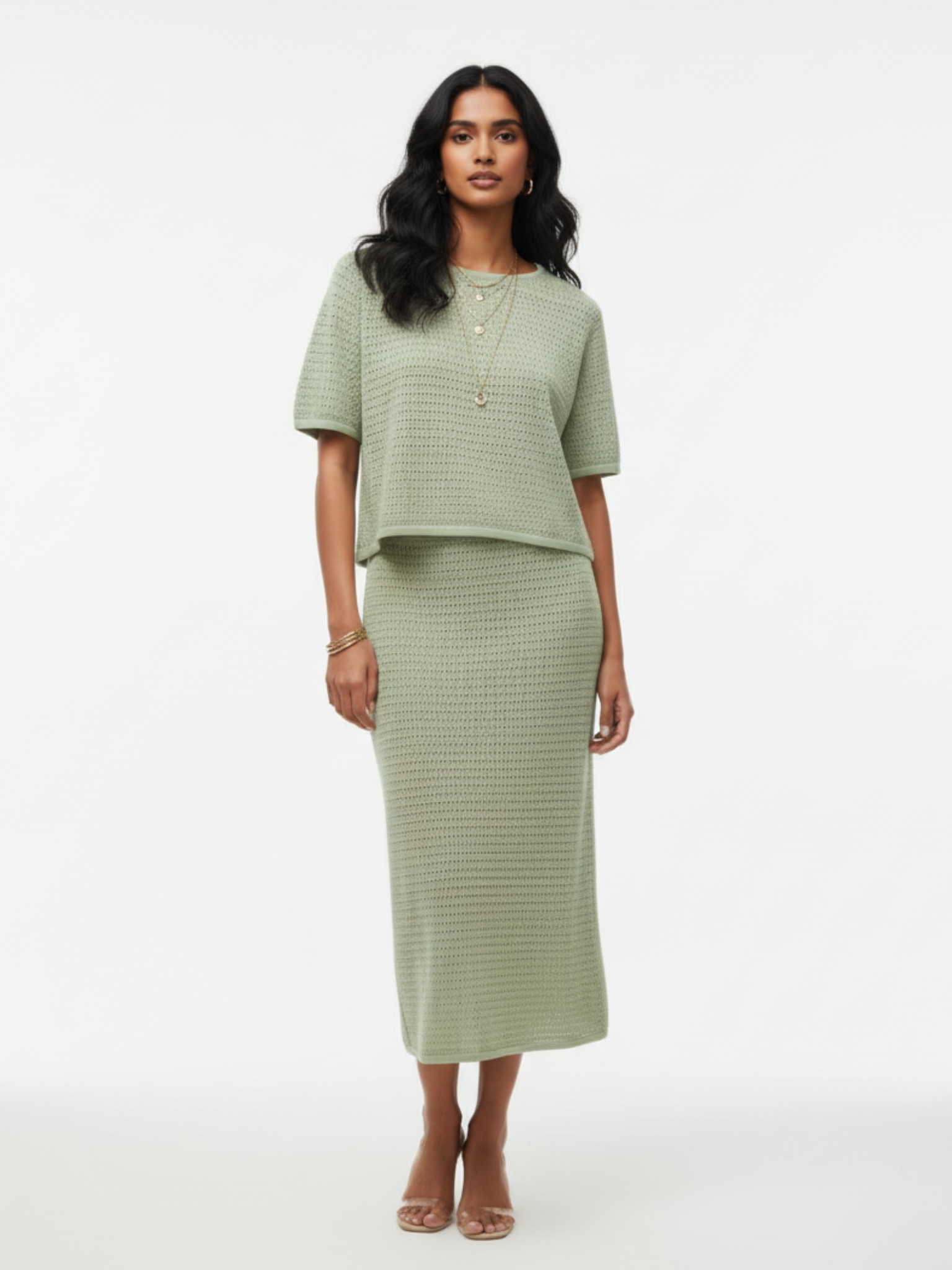 Effortless and elegant, the Sage Green Knit Top and Skirt Set defines modern minimalism with a touch of sophistication. Crafted from a soft, breathable knit fabric, this co-ord features a relaxed short-sleeved top paired with a matching midi skirt for a clean, cohesive look. The textured knit adds subtle dimension, making it perfect for both laid-back brunches and polished outings.