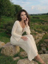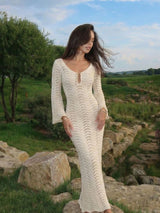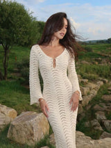 Elegant and romantic, this cream crochet maxi dress combines beachy texture with sophisticated evening appeal.