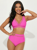 Make a vibrant statement with this electrifying hot pink bikini set featuring sleek sheer mesh panel details. The bold colour and sporty-chic silhouette combine to create the ultimate eye-catching beach look that radiates confidence.