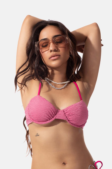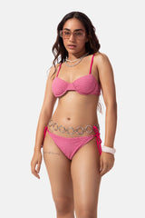 Playful meets powerful in this pink textured bikini set, crafted for both style and support. The underwire bikini top features a soft textured base with contrast pink strings, removable cups, adjustable straps, and a tie-back closure for a fully customizable fit. Paired with mid-rise bottoms finished with adjustable side strings, the set delivers a flattering silhouette with all-day comfort and a vibrant edge.