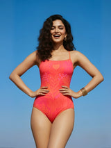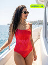 - Classic one-piece monokini in vibrant sangria red print