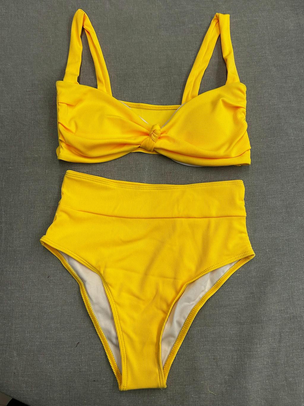 Brighten your beach wardrobe with this cheerful sunshine yellow bikini set featuring a chic twist-front top and high-waist bottoms. The bright lemon hue and flattering design details make this set a radiant poolside essential.