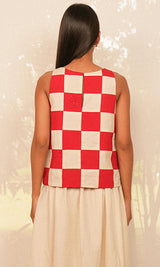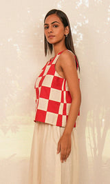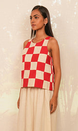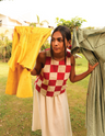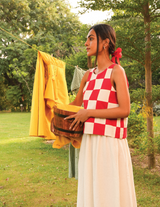 Ann’s Ala Top is a modern classic with an artisanal twist. Designed in soft cotton twill, it features bold square patchwork in red and white, accented with geometric embroidery in sequins and beads. The short, round-neck silhouette makes it versatile to style, while the intricate detailing adds a touch of statement charm.