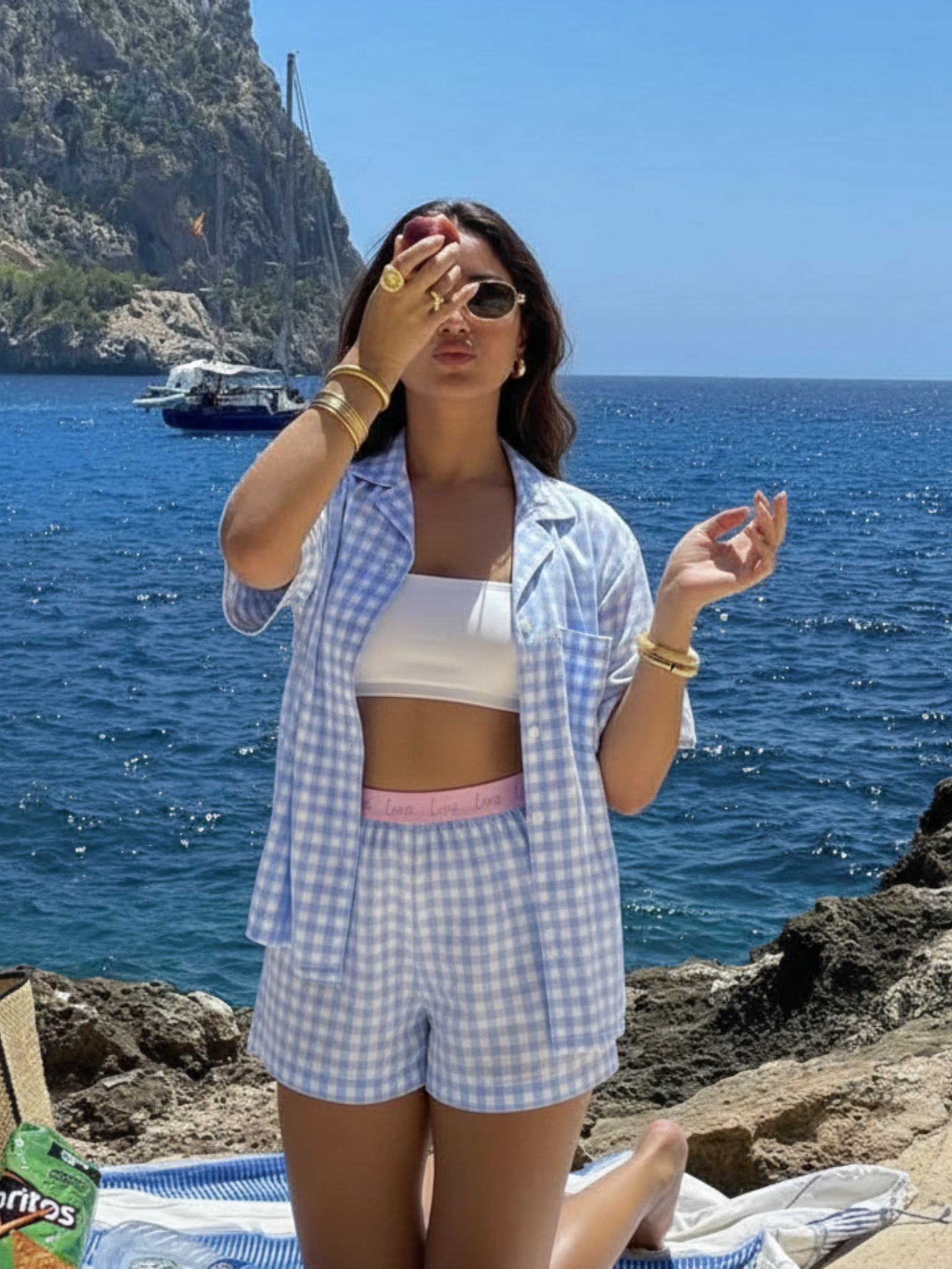 - Matching gingham shorts with elastic waist for easy, comfortable fit