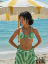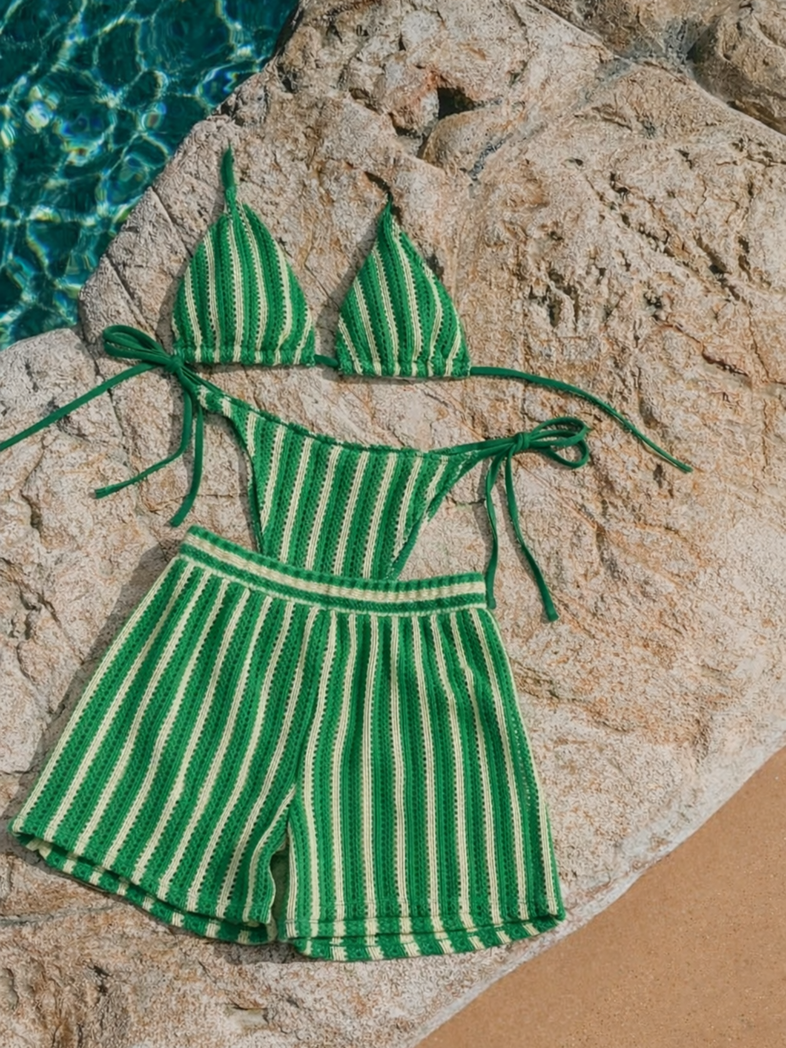 Embrace coastal boho chic in this striking green and cream striped crochet bikini set complete with coordinating shorts. The rich emerald green hue and handcrafted open-weave texture create a fresh, artisanal beach aesthetic that stands out from the crowd.