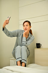 Adorned with sophisticated black piping and crafted in buttery-soft satin, it's equal parts elegant and calming. Perfect for sipping a warm cup of coffee, reading by the window, or just embracing quiet reflection.