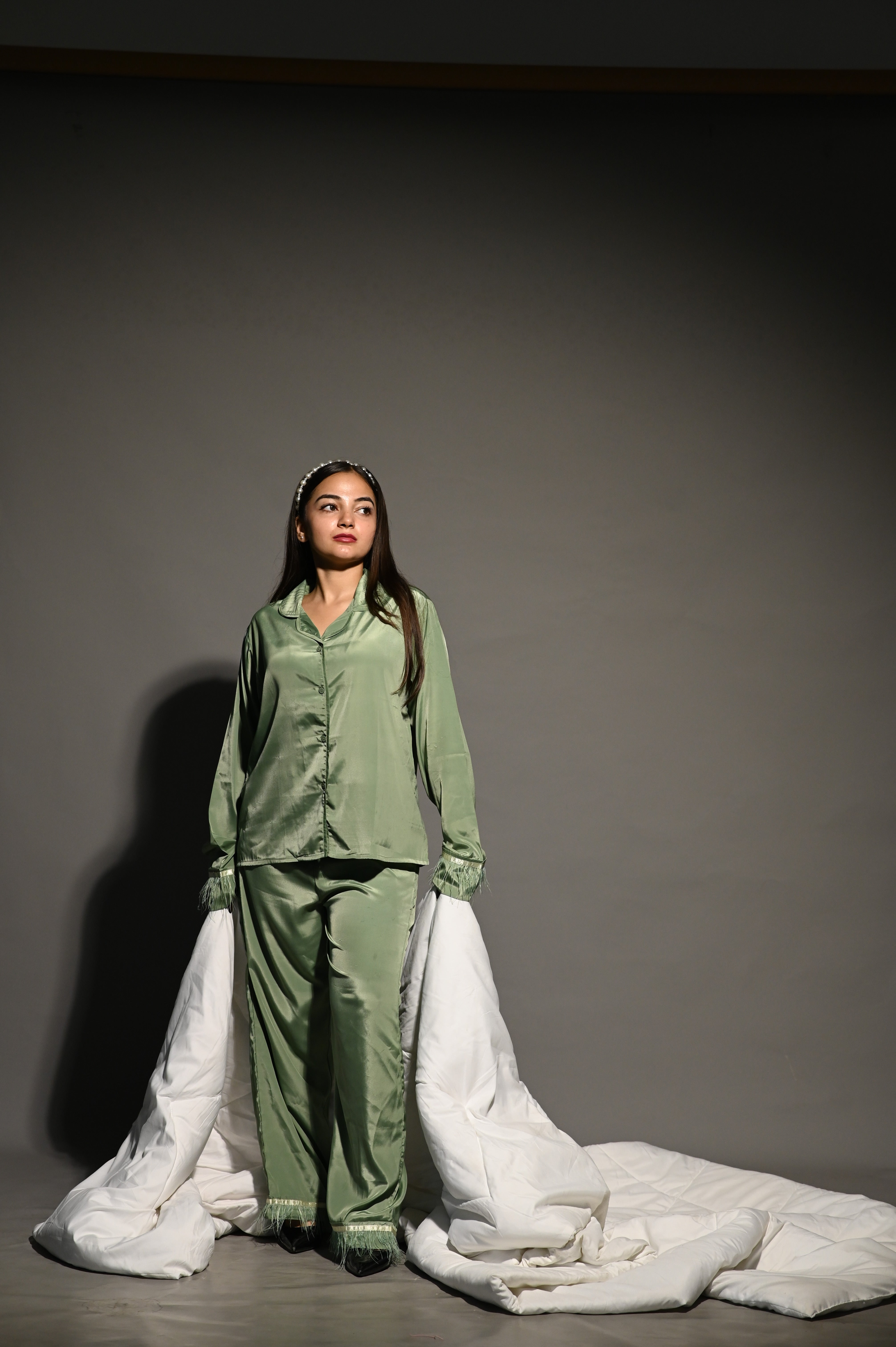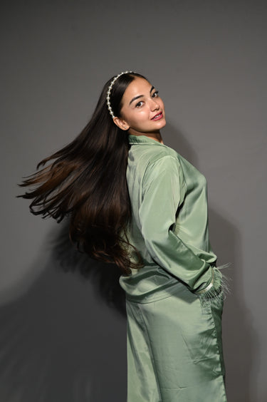 Mismatched celebrates the bride’s beautiful transformation — a seamless blend of old and new, tradition and individuality. Crafted in silky satin with feathered details, it’s a tribute to authenticity and the joy of becoming your truest self.