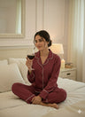 Crafted from smooth satin that glows softly under evening light, this set captures the allure of unhurried nights and timeless elegance. The deep burgundy hue feels warm yet refined, perfect for slow evenings, candlelit moments, or cozy self-care rituals that feel a little indulgent.