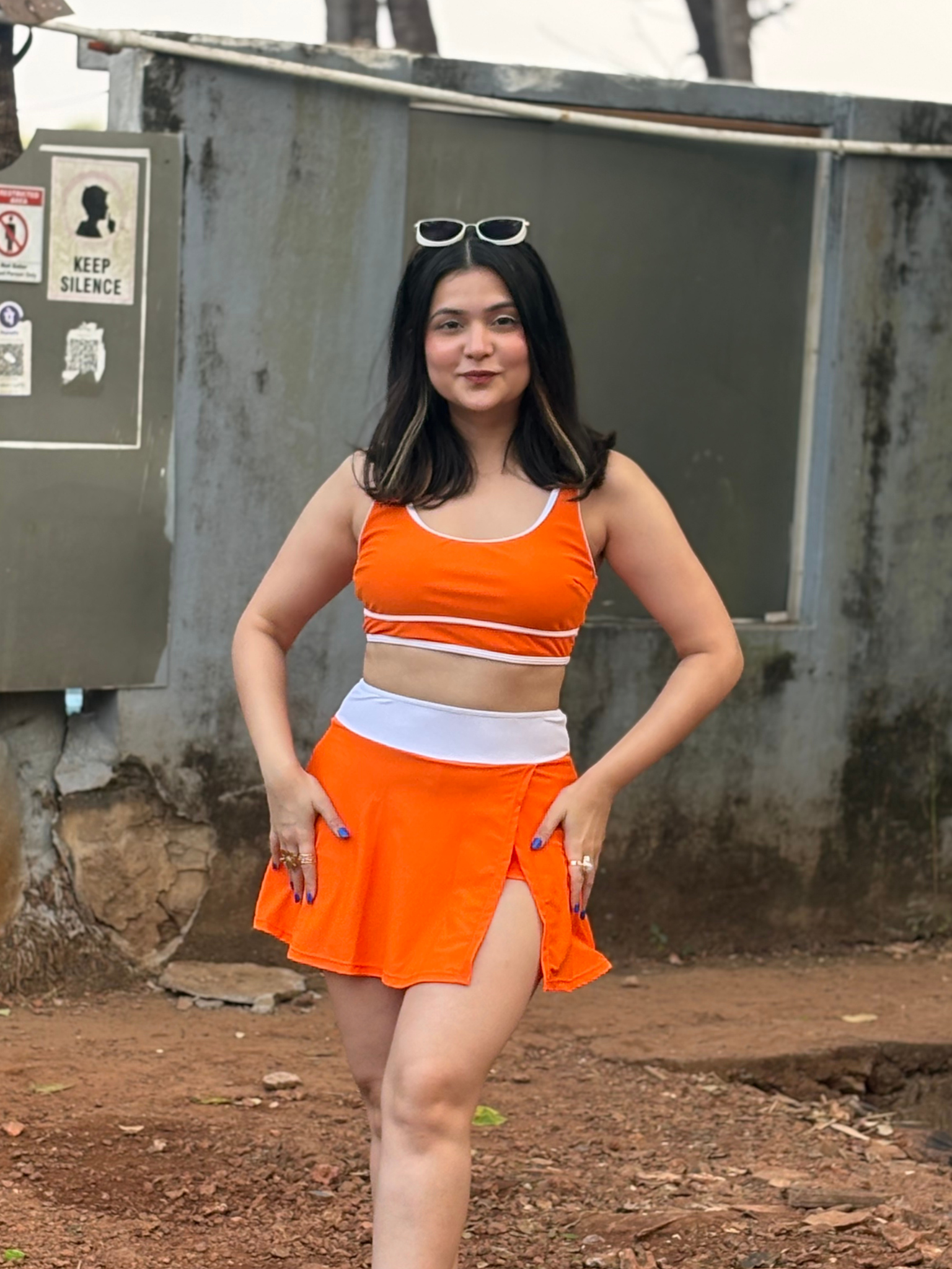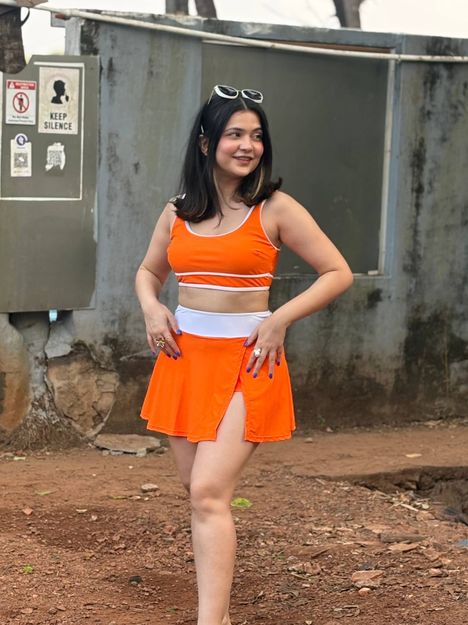 - High-waisted skort bottom with in built shorts in bold orange with a flattering white waistband that provides modest coverage while maintaining a flirty, feminine appeal