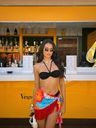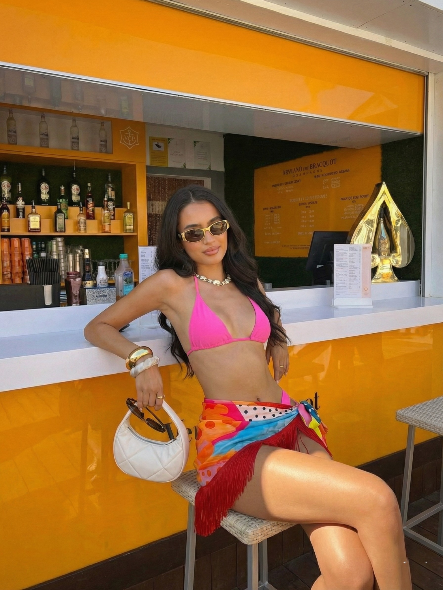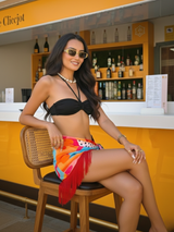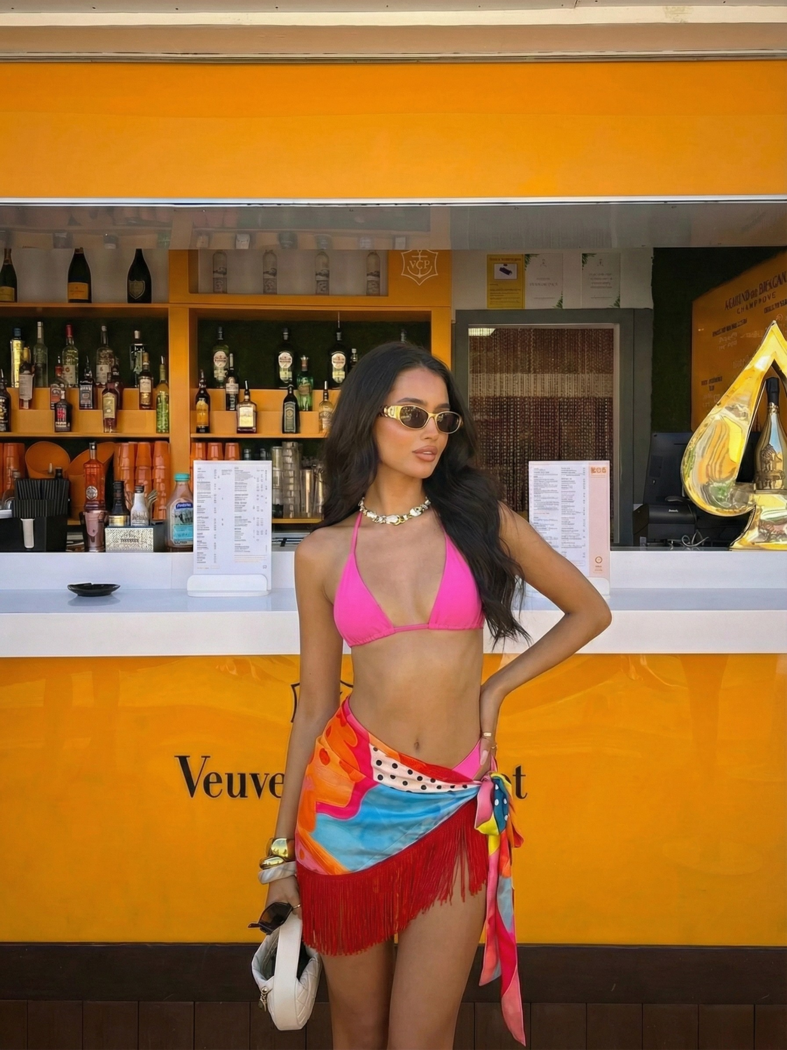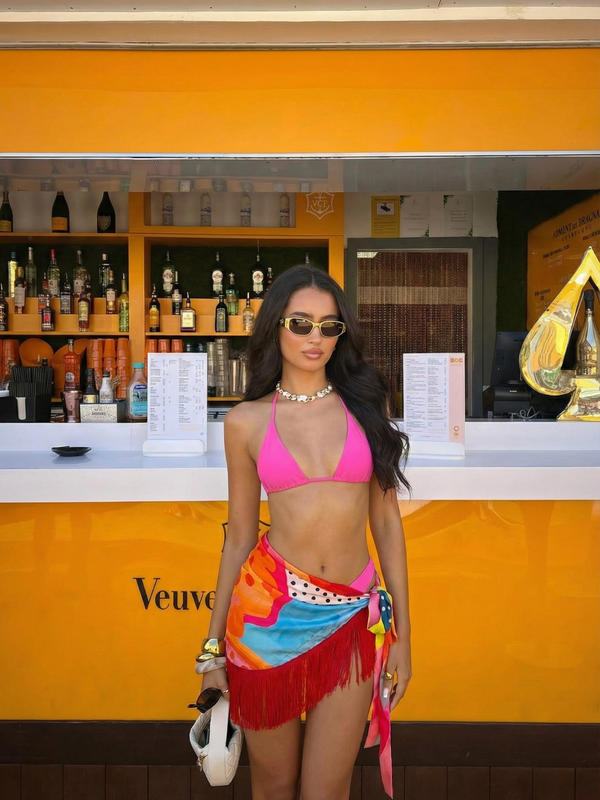 This vibrant printed beach sarong features eye-catching fringe trim and bold pattern mixing, creating a statement accessory that adds playful sophistication to any swimwear ensemble.