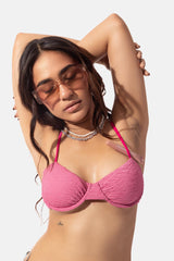 Playful meets powerful in this pink textured bikini set, crafted for both style and support. The underwire bikini top features a soft textured base with contrast pink strings, removable cups, adjustable straps, and a tie-back closure for a fully customizable fit. Paired with mid-rise bottoms finished with adjustable side strings, the set delivers a flattering silhouette with all-day comfort and a vibrant edge.