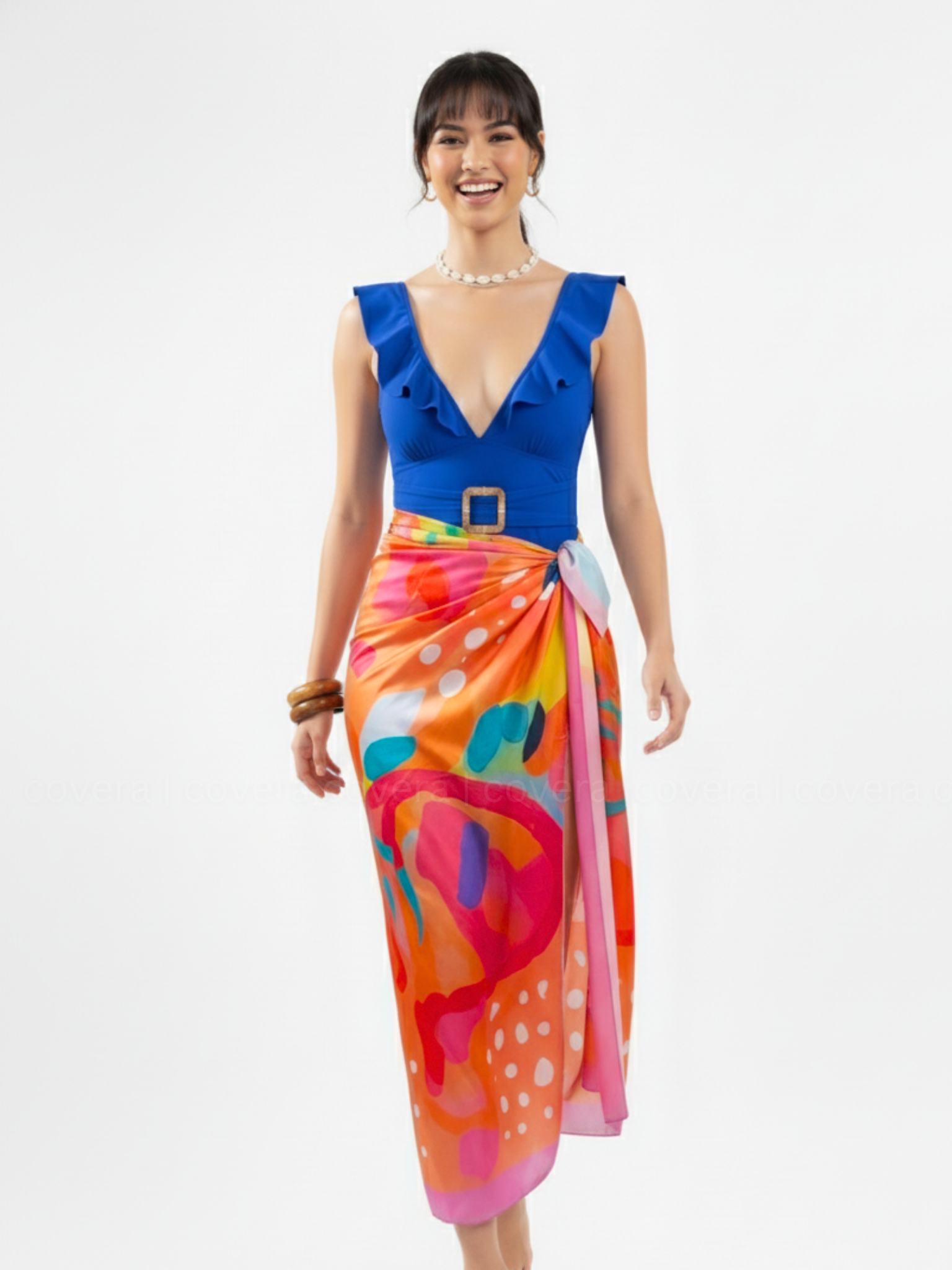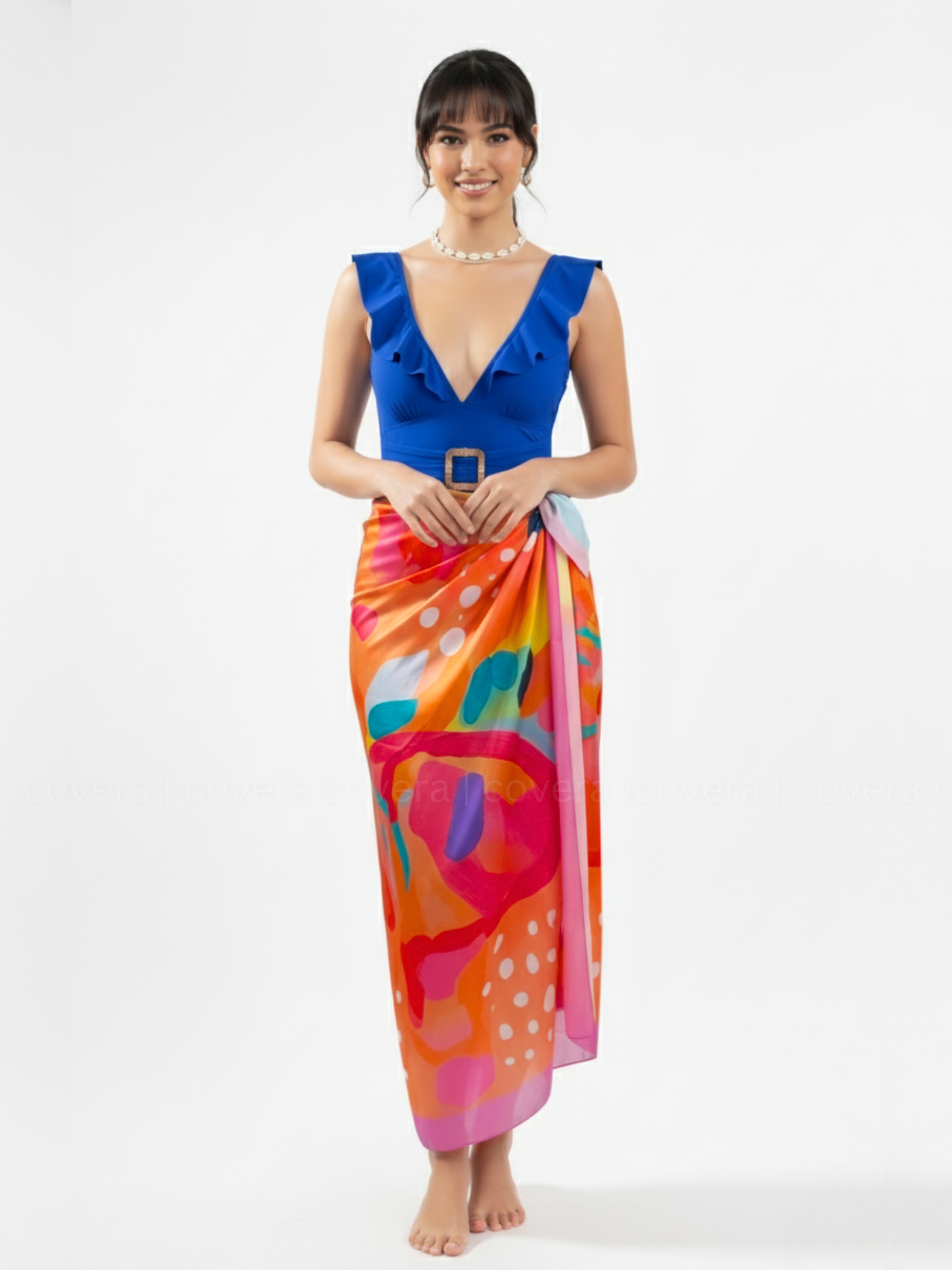 Dive into luxury with the Cobalt Blue Monokini paired with the vibrant Pina Colada Sarong — a duo that defines modern resort glamour. The monokini features a deep V-neckline adorned with soft ruffles and a statement belt accentuating the waist, creating a flattering and feminine silhouette. Crafted from premium stretch lycra, it offers a smooth, sculpting fit for confident movement. The look is elevated with the Pina Colada Sarong - a bold, tropical wrap in vivid hues of orange, pink, and coral, adding the perfect pop of vacation energy.