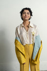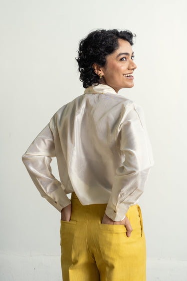 A timeless wardrobe essential, this off-white silk shirt pairs soft tailoring with artisanal detail. Designed with an oversized collar and cuffs, its elegance is elevated by a signature star brooch—embroidered with fine anchor thread and sequins—for a touch of subtle shimmer. The result is a versatile piece that transitions effortlessly from day to evening.