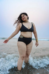 The Warrior Queen Set is designed for women who embody strength, confidence, and unapologetic self-love. This bold two-piece swimwear set brings together the supportive Warrior Queen Top and the curve-celebrating Warrior Queen BTM to create a look that feels both fierce and regal. Crafted in classic black with striking gold accent detailing, this set is made to honor real bodies.