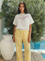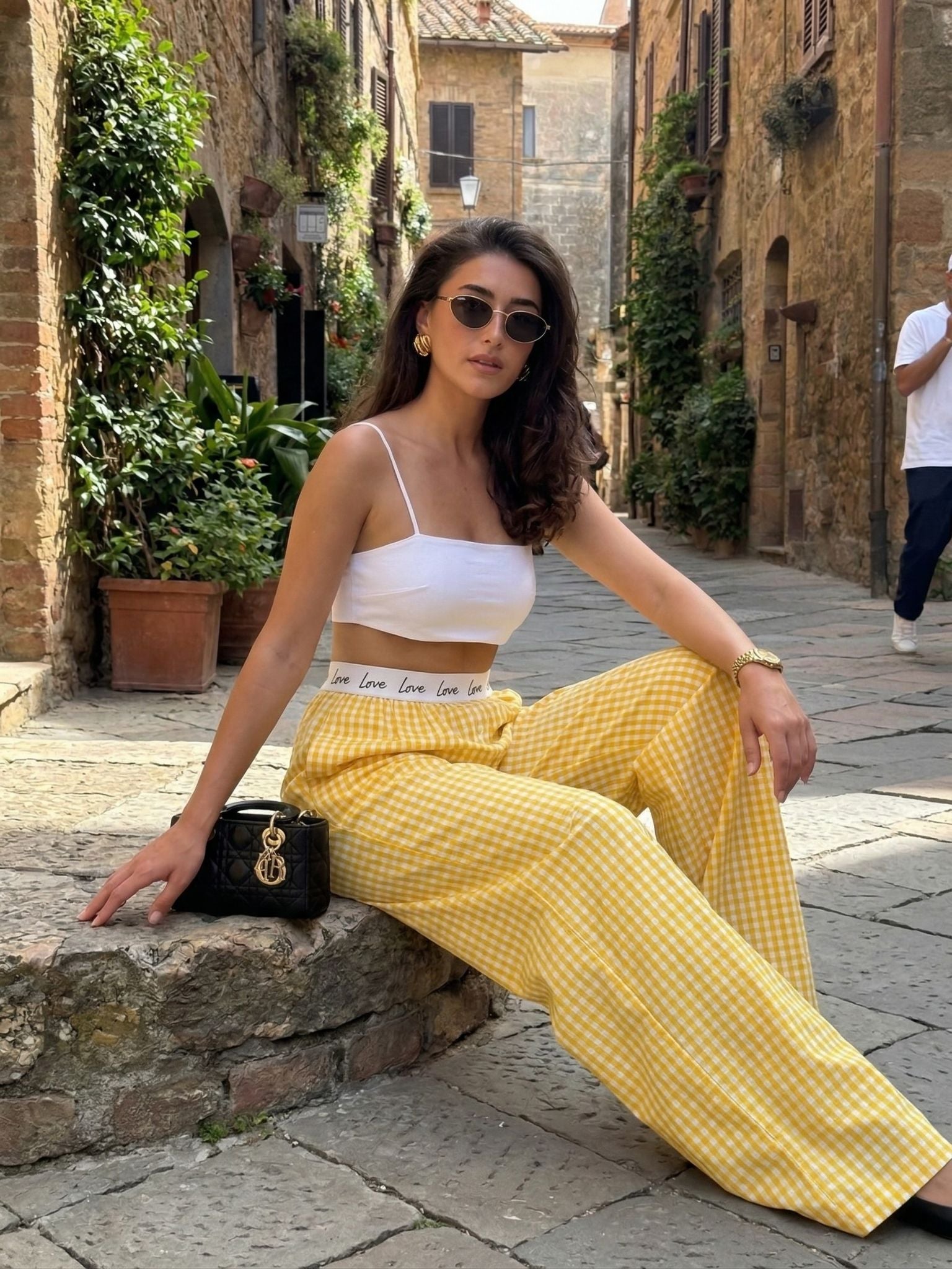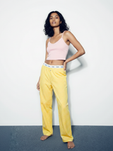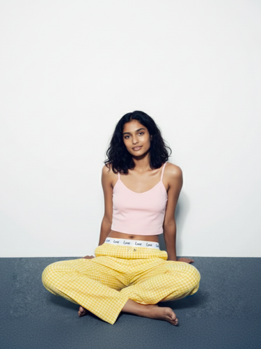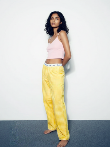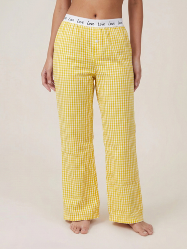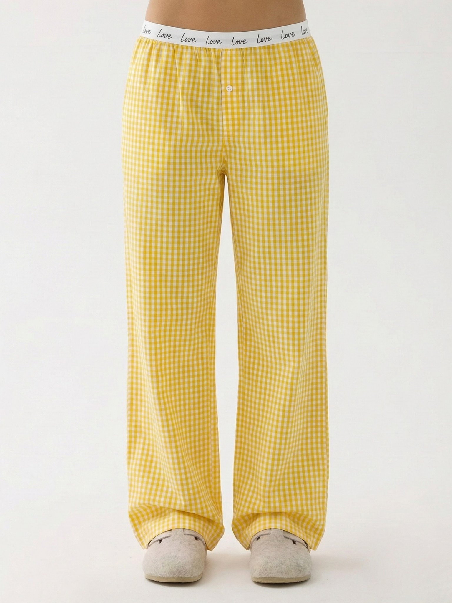 Add a pop of sunshine to your loungewear rotation with these adorable yellow gingham cotton pants featuring a playful "Love" waistband. The cheerful check pattern and comfortable wide-leg fit make these perfect for relaxing weekends and cozy at-home days.