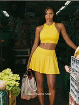 Radiate sunshine vibes in this stunning Yellow Halter Swim Skort Set that brings sophistication to your swimwear collection. The vibrant butter yellow shade commands attention while the athletic-inspired design delivers both style and functionality.